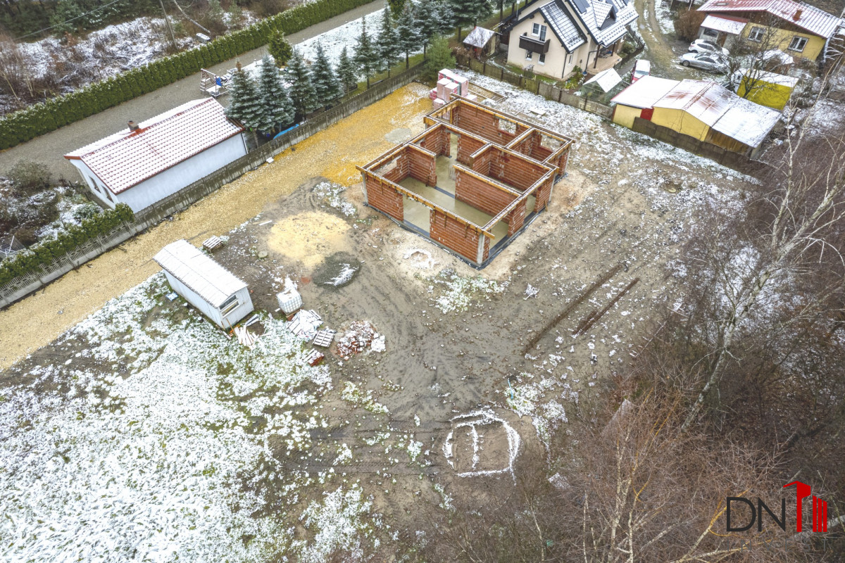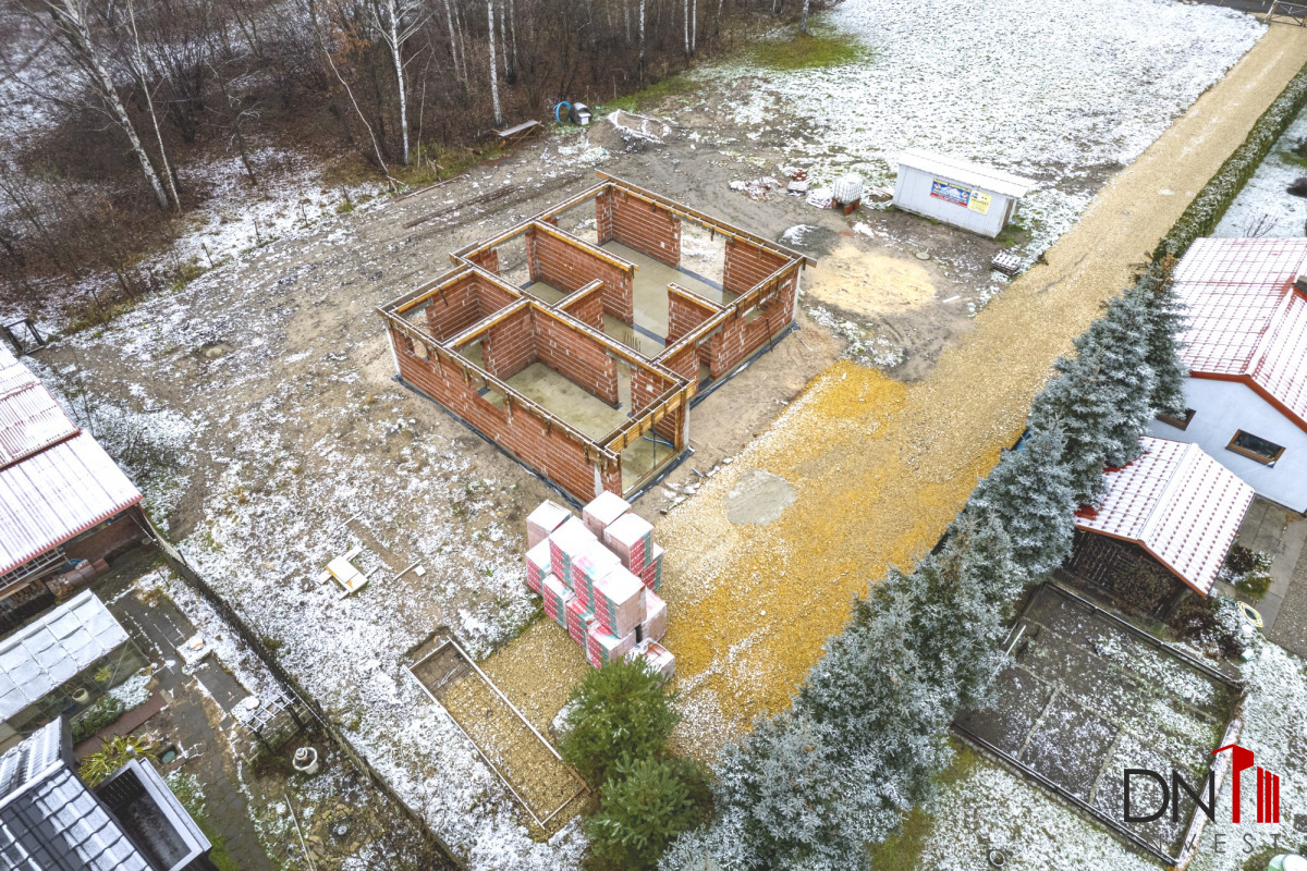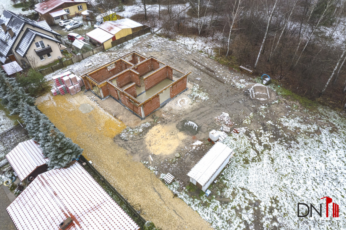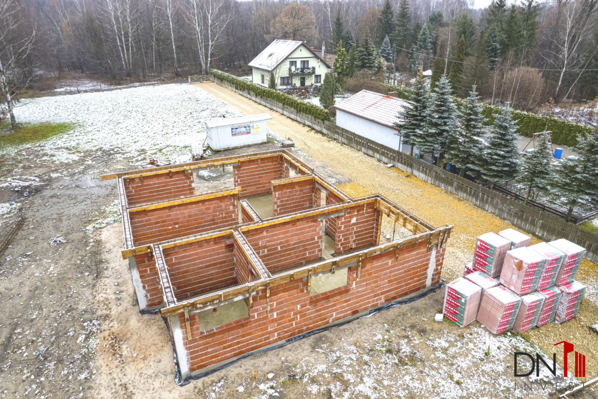 Na działce jest rozpoczęta budowa domu jednorodzinnego, którego wykonanie zaplanowano w technologii tradycyjnej według projektu widocznego na zdjęciach. Zostały wykonane prace budowlane obejmujące: wymianę gruntu oraz wyrównanie i utwardzenie terenu, wykonanie płyty fundamentowej oraz pierwszej kondygnacji budynku.