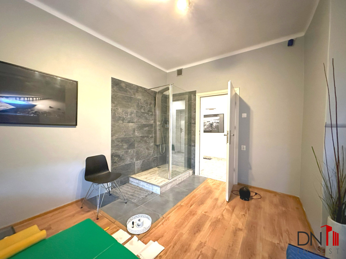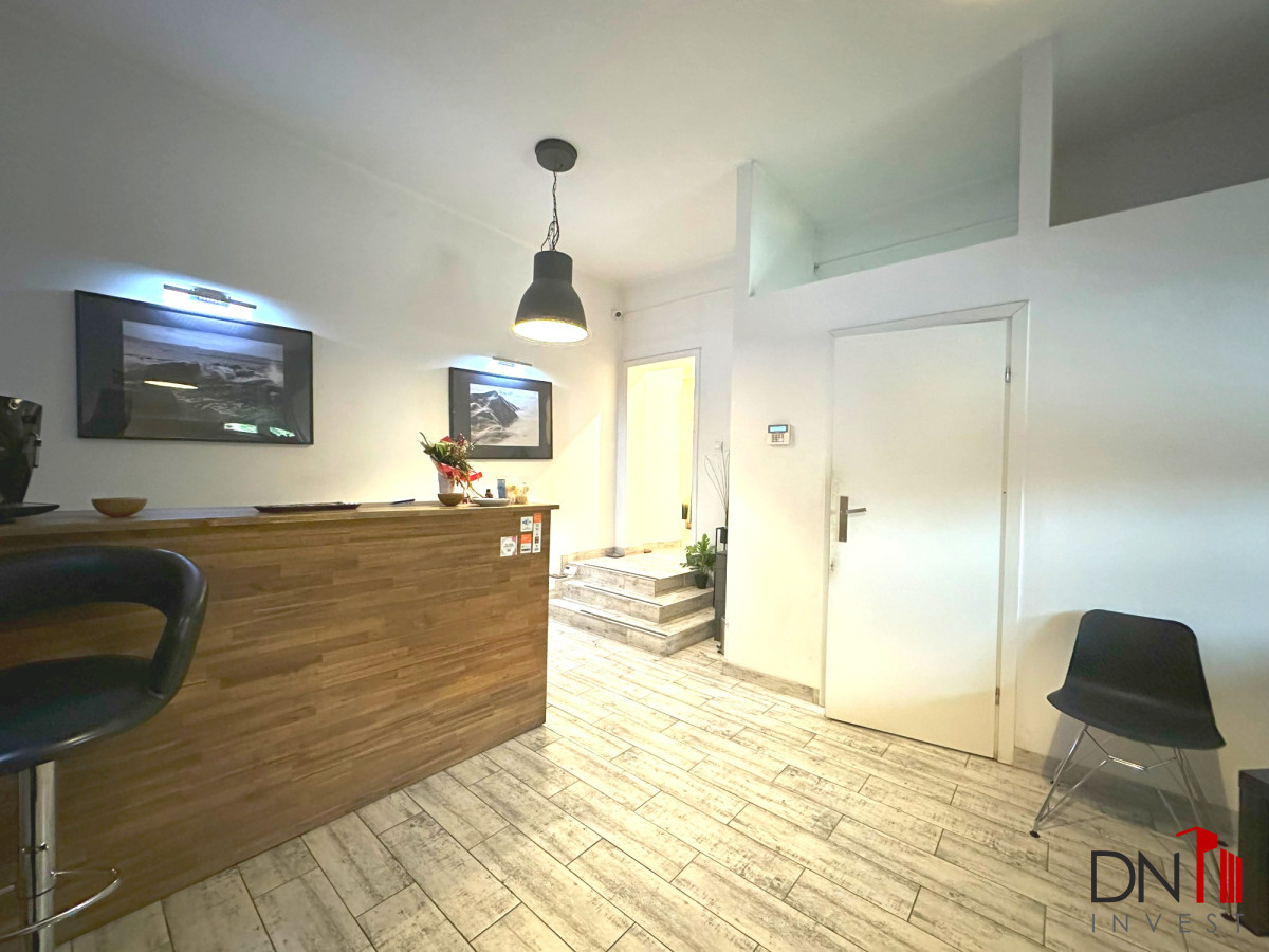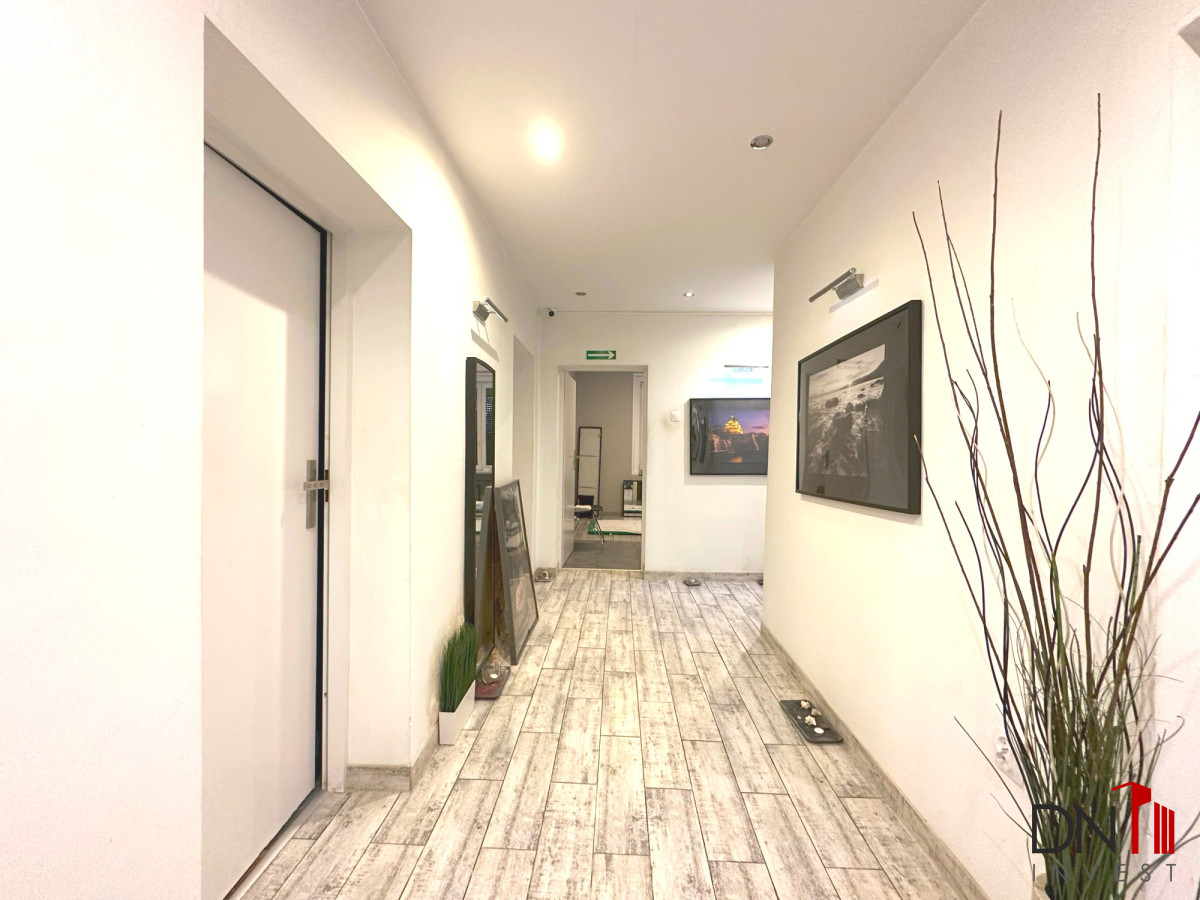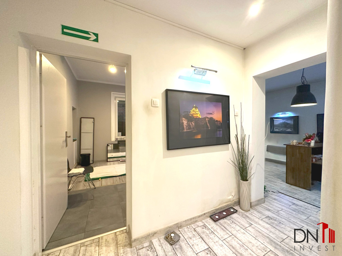 126,4 m2 składają się: recepcja, przedpokój, pięć niezależnych i ustawnych pokoi, duża kuchnia, łazienka z WC. Do lokalu przynależą 2 piwnice. W pobliżu znajdują się: